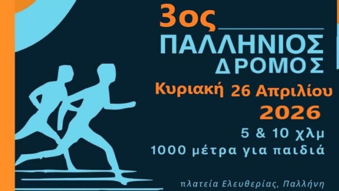 Ο Αθλητικός Πολιτιστικός Σύλλογος «Παλλήνιοι Δρομείς» και ο Δήμος Παλλήνης προκηρύσσουν την Αθλητική – Πολιτιστική συνάντηση «3ος Παλλήνιος Δρόμος» 5 & 10 χλμ. και 1.000 μ. για παιδιά την Κυριακή 26 Απριλίου 2026 και ώρα 8:30 π.μ. με αφετηρία την Πλατεία Ελευθερίας (παλαιό Δημαρχείο) στην Παλλήνη.