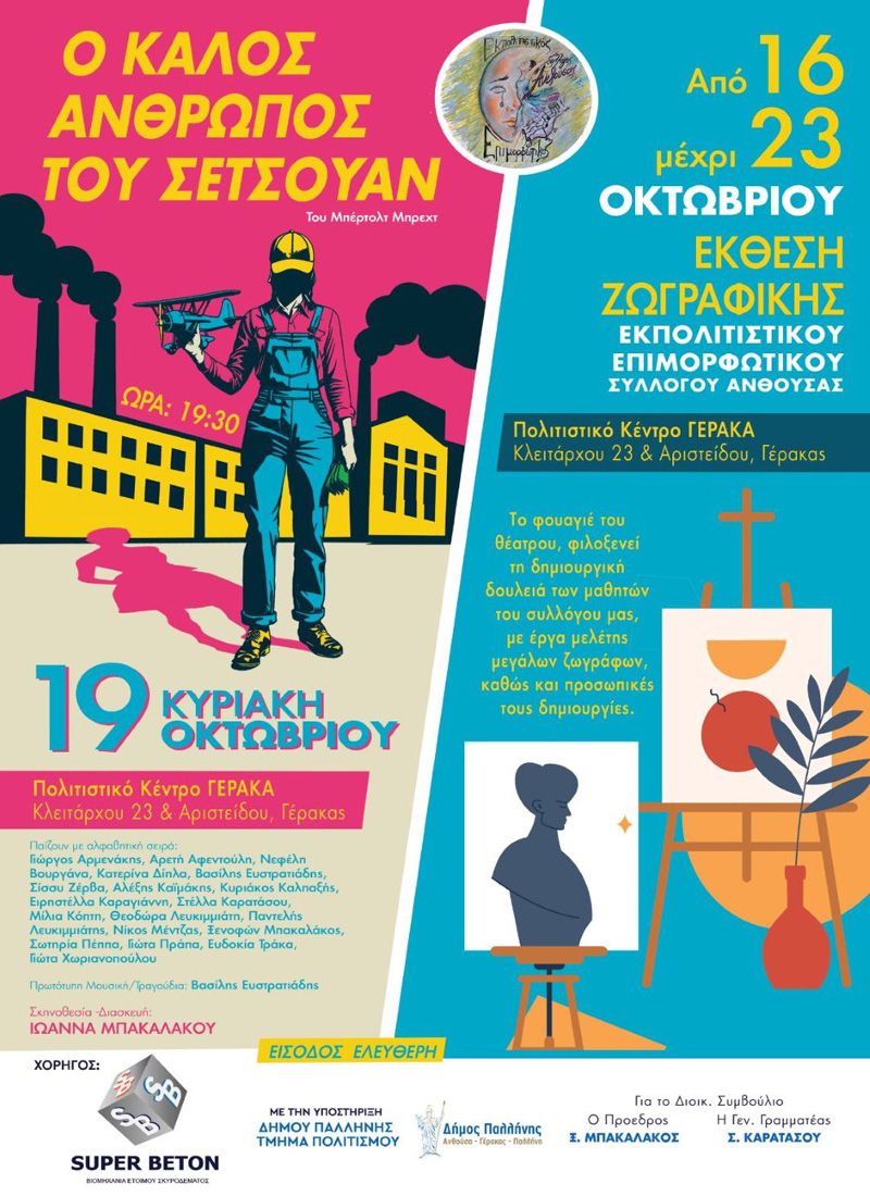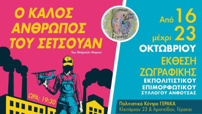 ην θεατρική παράσταση «Ο καλός άνθρωπος του Σετσουάν» του Μπέρτολτ Μπρεχτ παρουσιάζει την Κυριακή, 19 Οκτωβρίου 2025 και ώρα 7:30 μ.μ. στο Πολιτιστικό Κέντρο Γέρακα, ο Εκπολιτιστικός Επιμορφωτικός Σύλλογος Ανθούσας με την υποστήριξη του Δήμου Παλλήνης.
