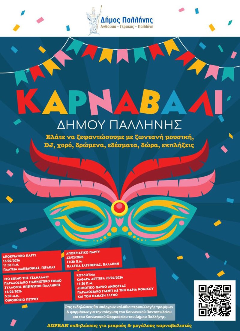 Τι αποκριάτικες εκδηλώσεις 2026 καθώς και του εορτασμού της Καθαράς Δευτέρας, ανήγγειλε η Δημοτική Αρχή Παλλήνης.